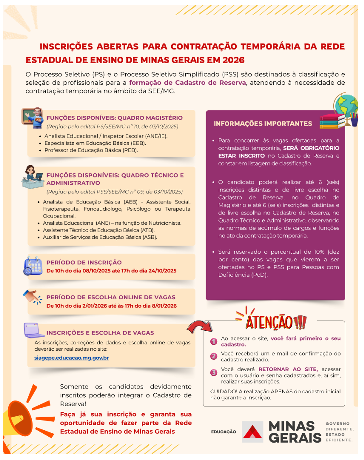 Cadastro de Reserva de contratação temporária para a Rede Estadual de Ensino de Minas Gerais em 2026.